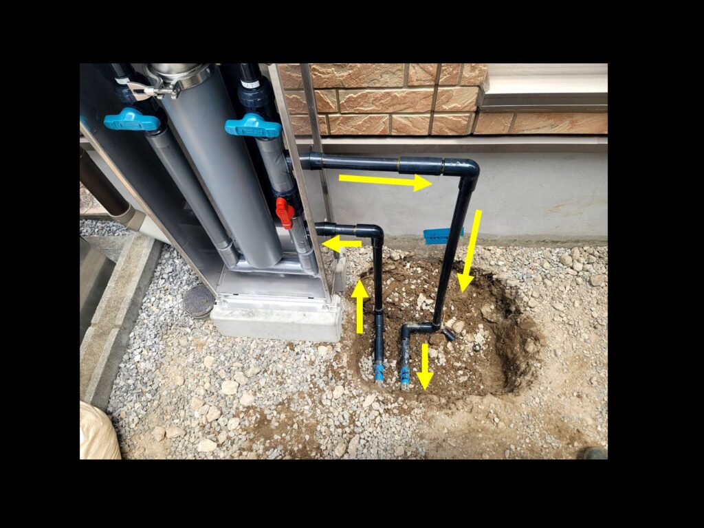 配管が終わりました。黄色の矢印が水道水の流れです。